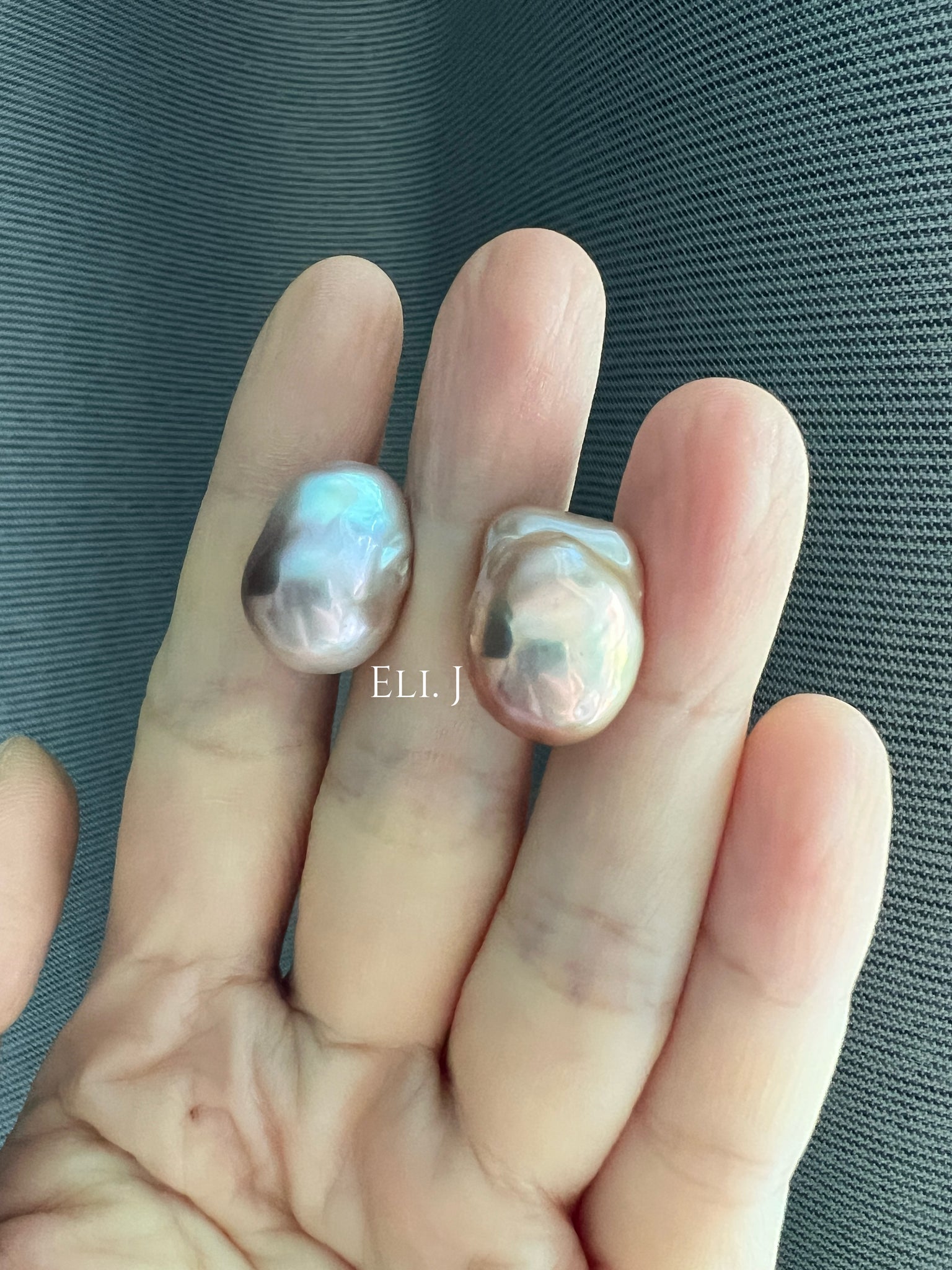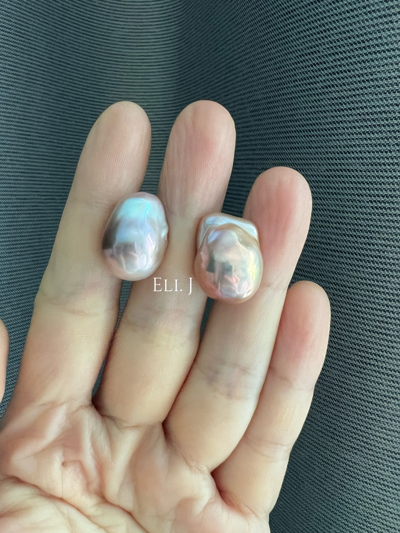 AAA-top quality baroque pearls in purple-peach, with rare blue-rainbow lustre.