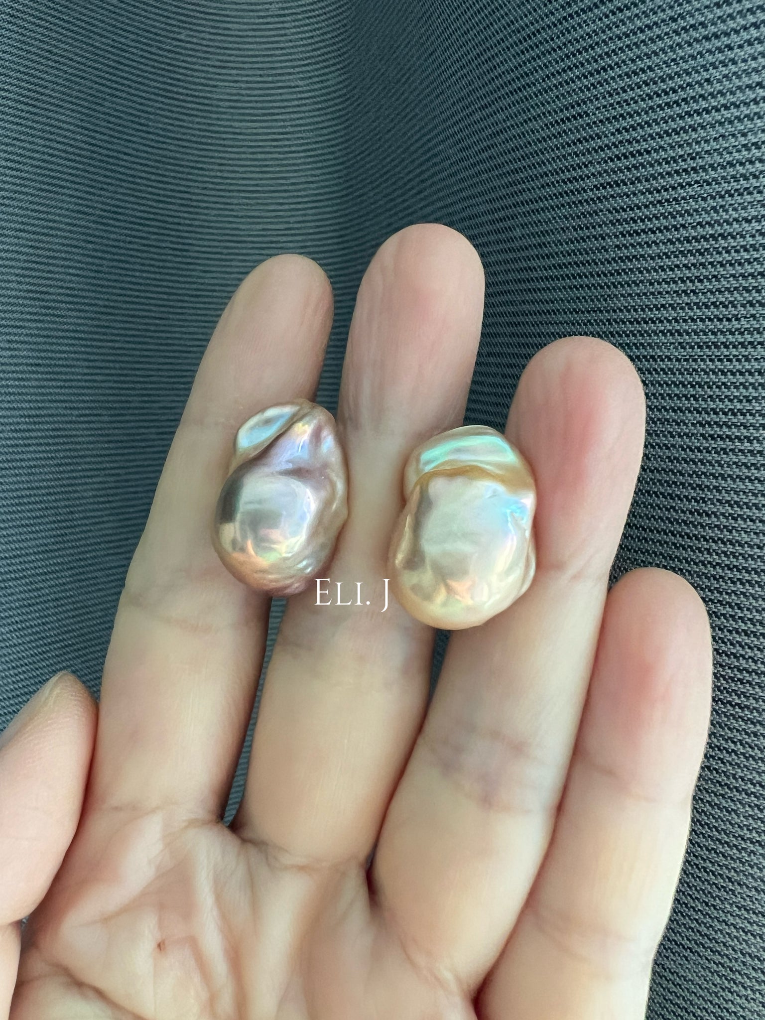 AAA-top quality baroque pearls in purple-peach, with insane golden-rainbow lustre. Such a special pair!