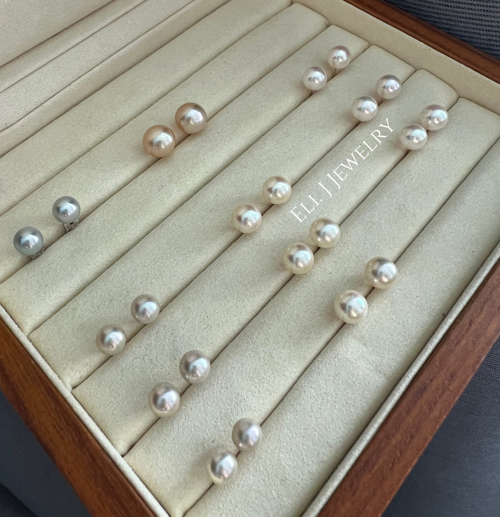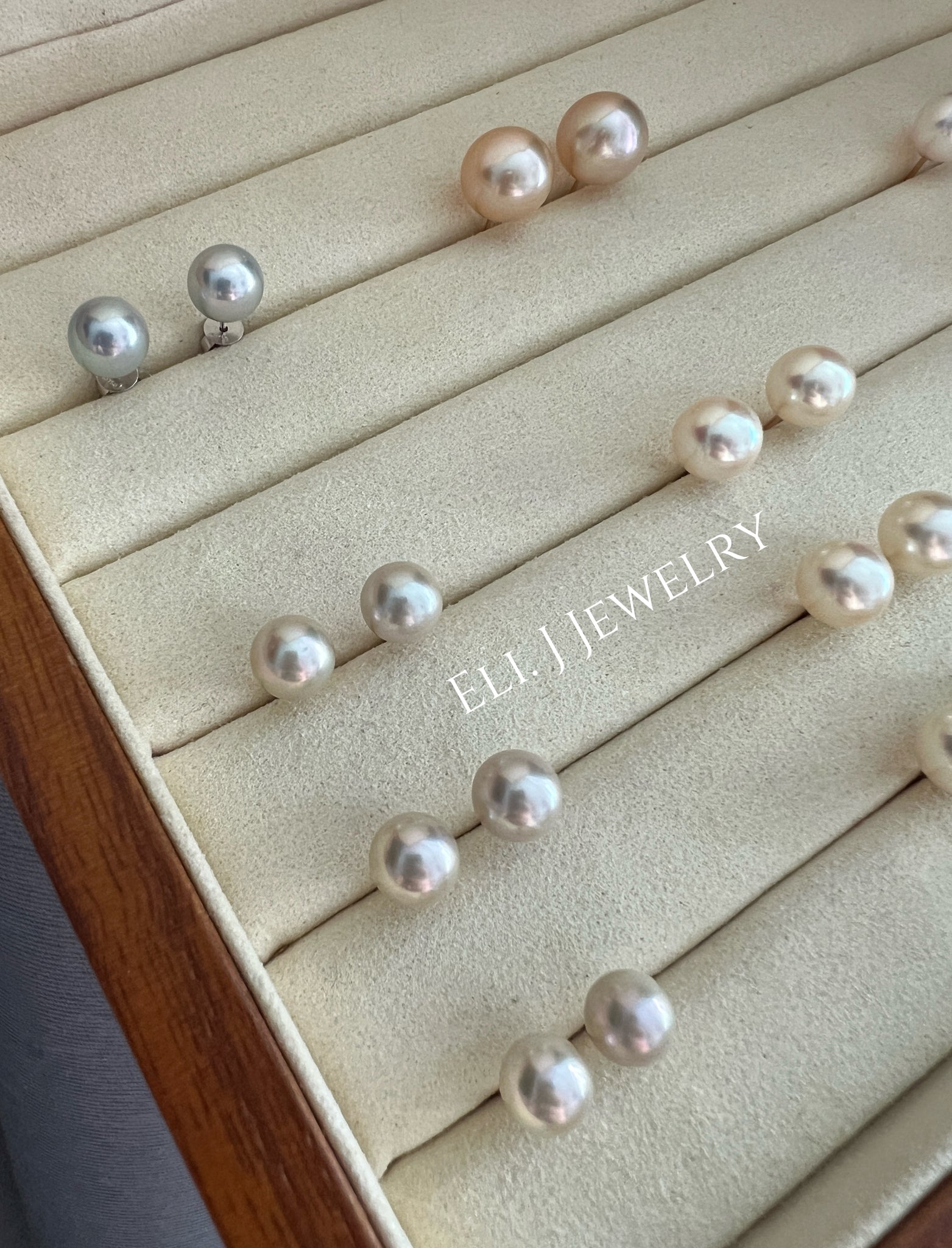 #9-11: (RARE, average, most common size is 7-7.5mm) Japanese Ivory-PINK Akoya pearl studs in larger size 8.5-9mm, perfect-round with 18K solid gold posts.