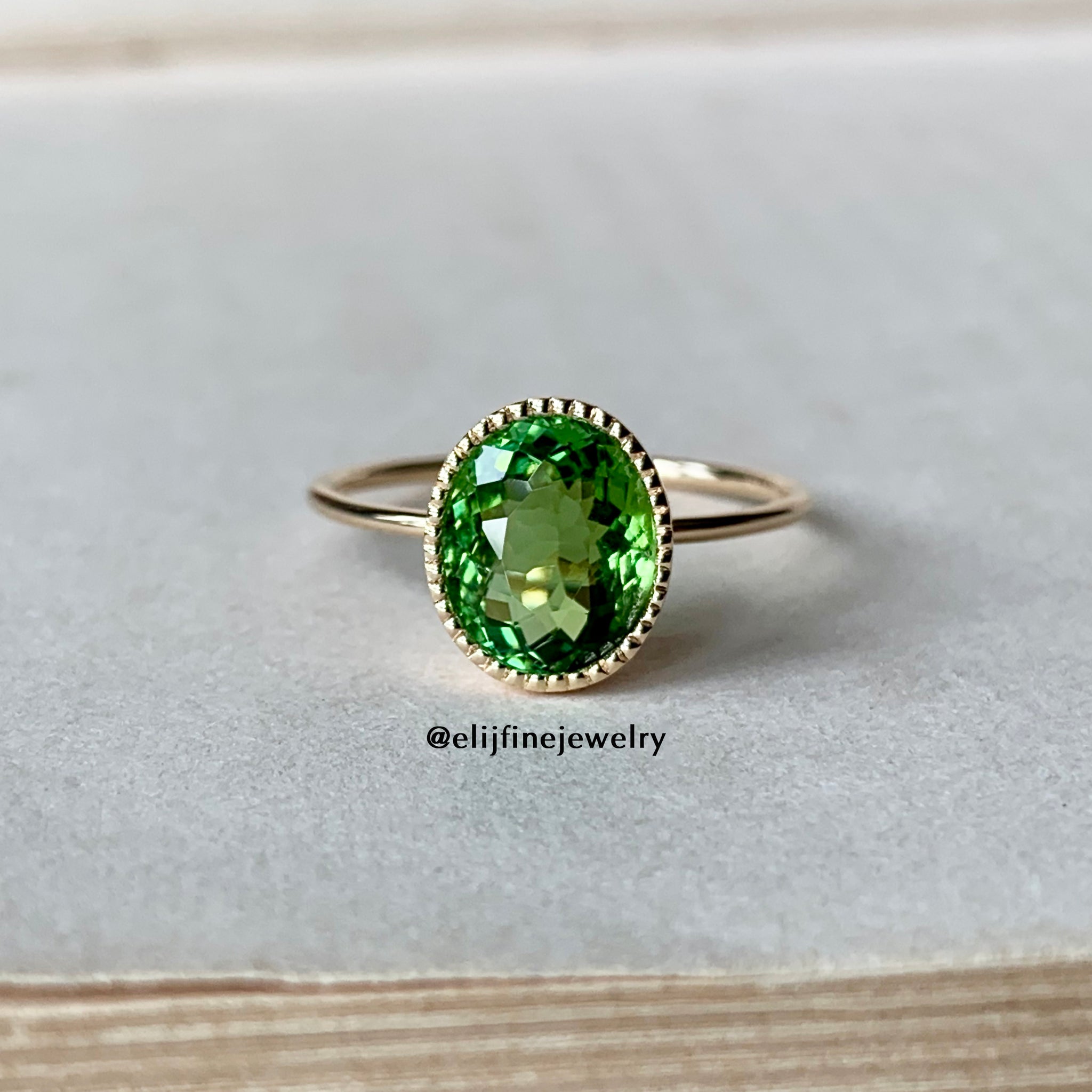 A glowing green tourmaline (1.8ct), bezel set with delicate milgrain detail, set in 14k solid yellow gold.